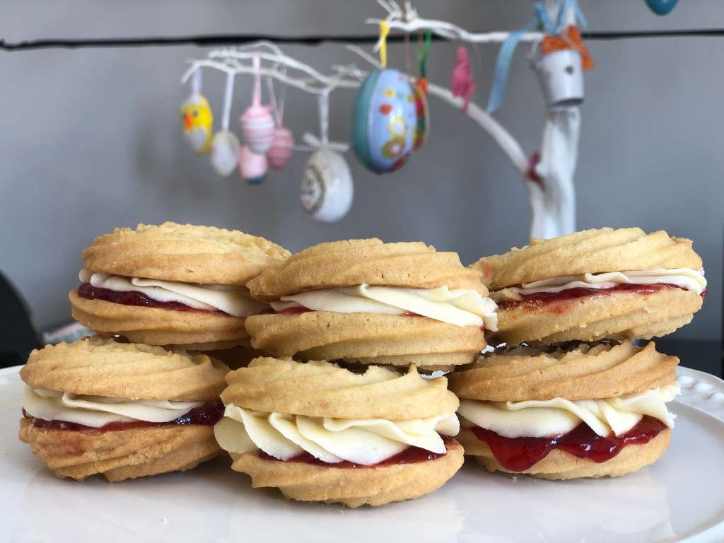 Soft, buttery and delicate these mouth-watering biscuits are sandwiched with piped vanilla buttercream and strawberry jam or lemon curd.